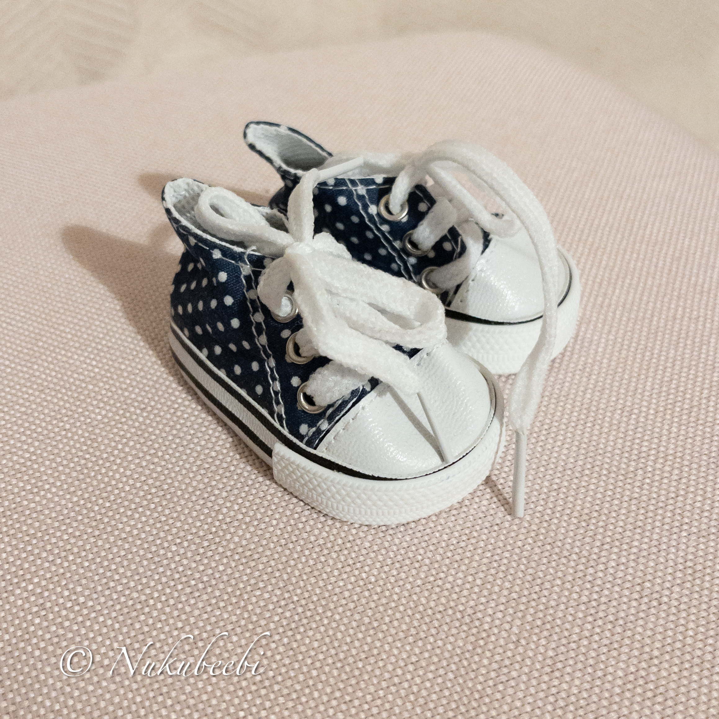 Papud tumesinised täpilised on mõeldud nukule 7cm tallaga. Sobivad Baby bornile ja teistele 43-46cm nukkudele.